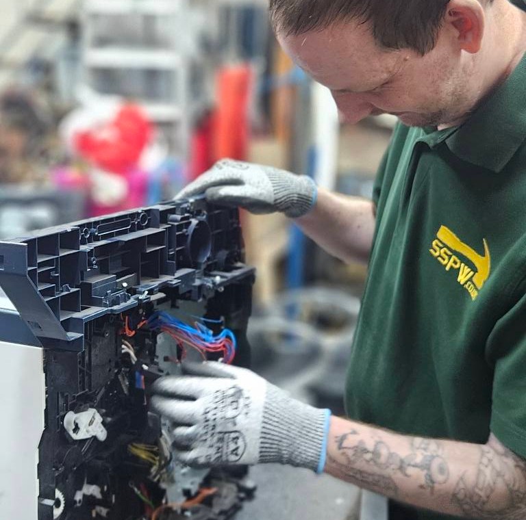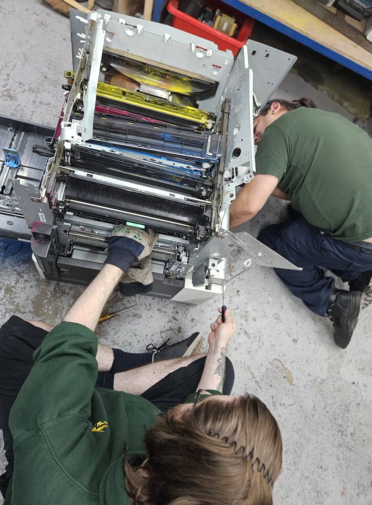 Garage/Mechanical: This department strips old cars, photocopiers printers, videos etc... for recycling. Manufactures, wrought iron work gates, pot stands, etc... and generally works with all things mechanical, occasionally, computers are donated, these items are stripped and the hard drive destroyed, if found to be operational, they are checked for electrical safety and rebuilt for the users to operate at the shop /workshop. All electrical items donated to SSPW come to this department for testing and if found to be of no use, are stripped by the users.